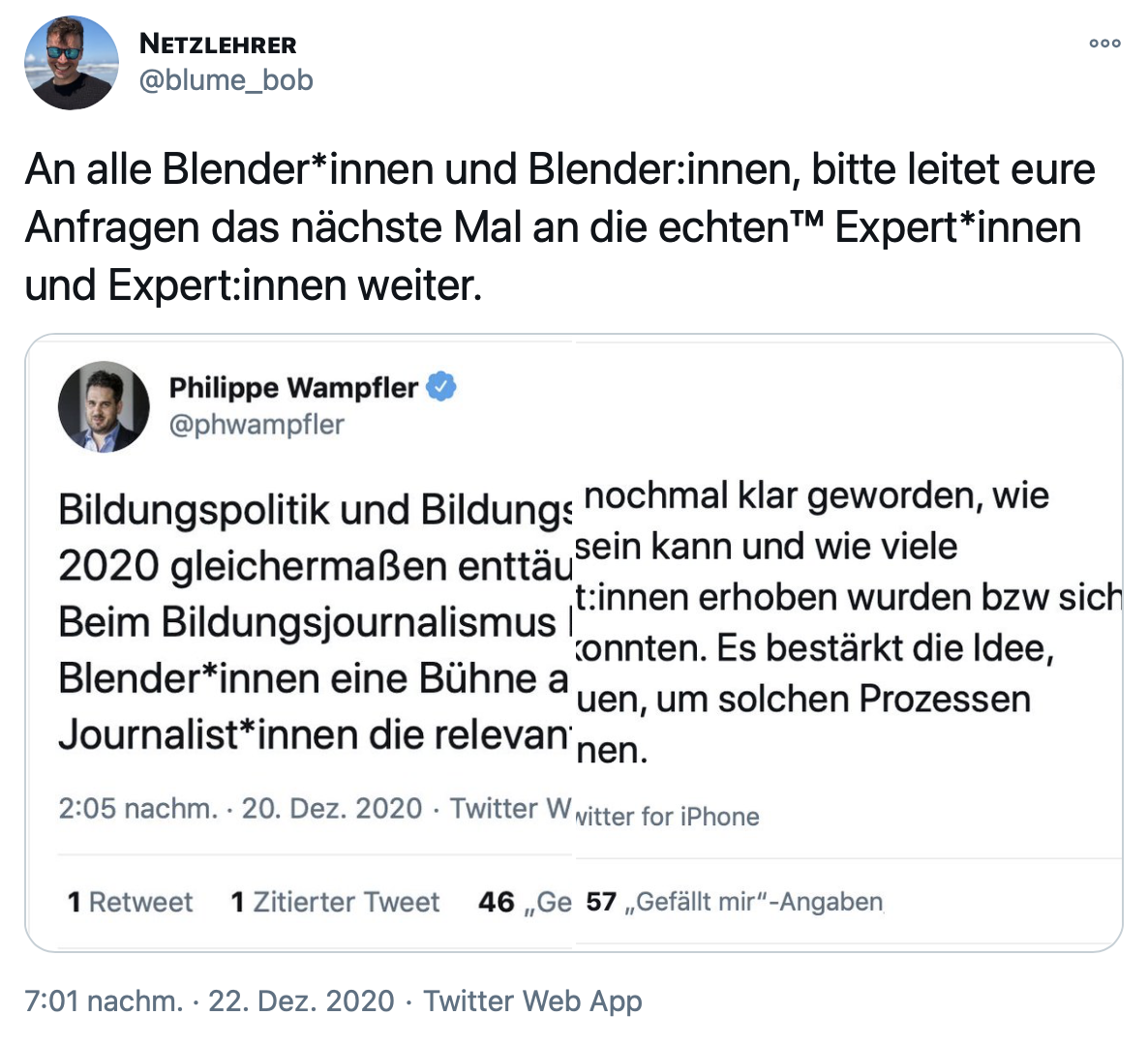 Bob Blume griff am Abend dann diese Darstellung auf und präsentierte sie sarkastisch seinen Followern. (Weil er zwei Screenshots verwendete, ist mein Tweet rechts nur vollständig zu lesen, wenn man ihn in seinem Tweet anklickt.)
