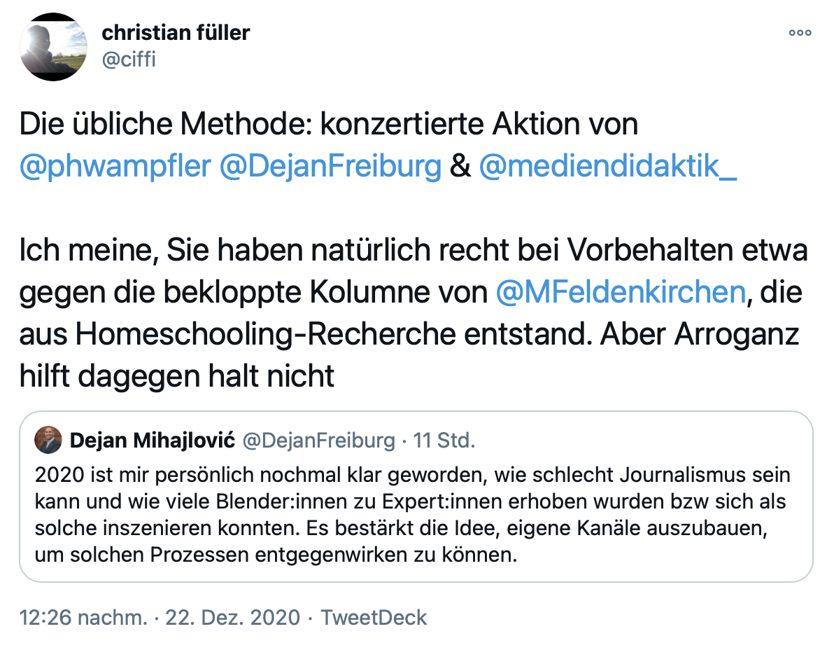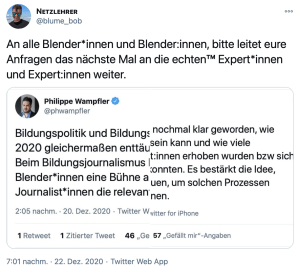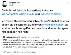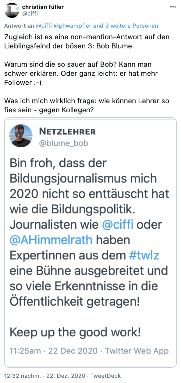 Keine fünf Minuten später griff der Journalist Christian Füller meinen Tweet auf, stellte einen Zusammenhang zu einem ähnlichen Tweet von Philippe Wampfler her, den der zwei Tage zuvor veröffentlicht hatte und verkündete eine konzertierte Aktion.